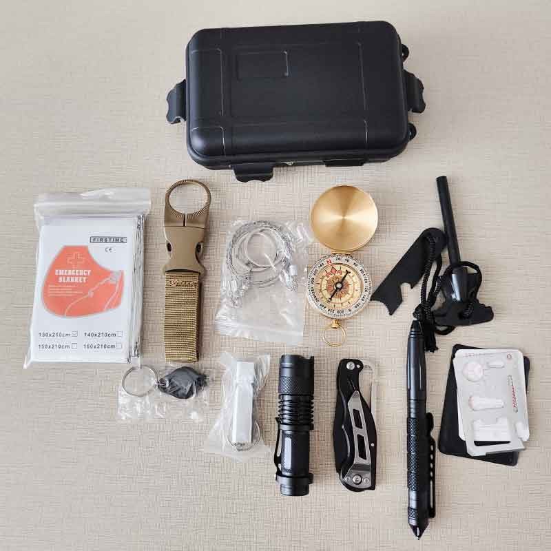 این پک شامل 8 محصول کاربردی و مهم می باشد که همگی در یک کیف با حجم بسیار کم جای شده و می تواند همراه همیشگی شما باشد. این محصول شامل چاقو کارتی، فندک مخصوص، قلم بقاء، چراغ قوه و جاسویچی کوچک، قطب نمای چند منظوره که همگی بسیار کاربردی و لازم می باشد. چاقوی این پک دارای جنس استیل ضد زنگ و کاربردهایی مثل درب بازکن، آچار و.. می باشد. جنس فندک این پک از آهن و منیزیوم و می توان براحتی با آن آتش روشن کرد.قلم بقاء این پک از جنس فولاد و کاربرد آن برای شکستن شیشه و فرار اضطراری می باشد. چراغ قوه این پک نیز دارای نور قوی و شفاف است.