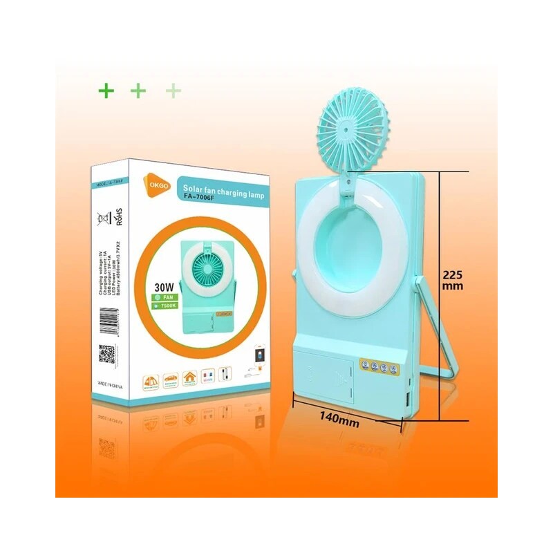چراغ اضطراری خورشیدی 30 وات OKGO مدل FA-7006F در واقع چند کاره می باشد می توان به عنوان چراغ شارژی برای کوهنوردی و کمپینگ و... استفاده کرد و هم می توان در منزل به عنوان چراغ مطالعه از نور آن لذت برد، همچنین دارای خروجی یو اس بی می باشد که می توان به کمک آن گوشی، تبلت یا هر وسیله دیگر را شارژ نمود. همراه چراغ اضظراری یک لامپ کوچک یو اس بی نیز وجود دارد که در عین کوچک بودن می تواند بسیار کاربردی باشد و به عنوان چراغ مطالعه نیز از آن استفده نمود. از ویژگی های جالب چراغ اضطراری خورشیدی داشتن یک فن متحرک می باشد که قابلیت تنظیم دور تند و آرام را نیز داردو می توانید از آن به عنوان پنکه کوچک استفاده کنید.